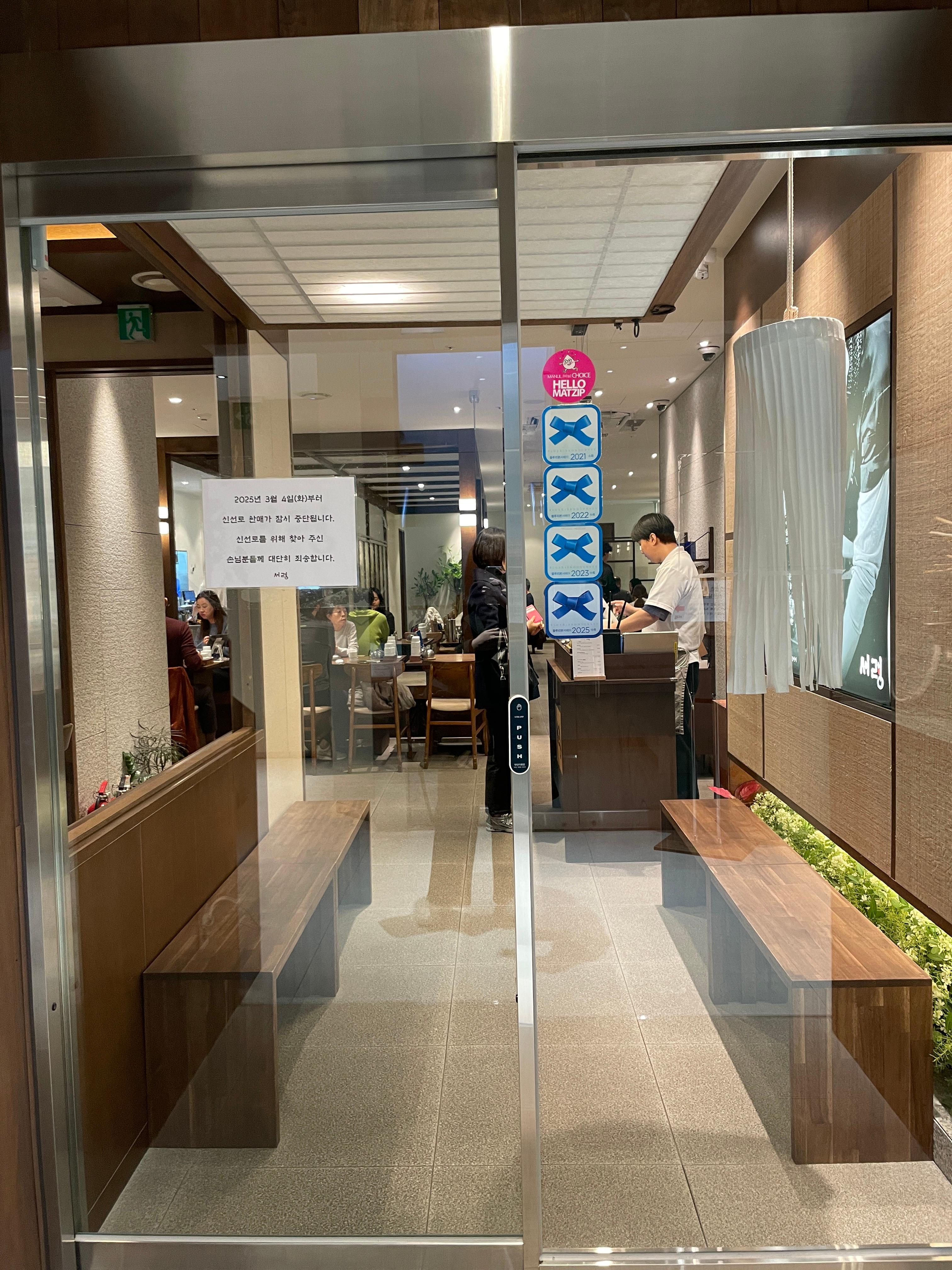 블루 리본 스티커가 보이고, 25년 3월 4일 이후부터 신선로 메뉴를 일시 중단 한다는 공지가 붙어 있습니다.